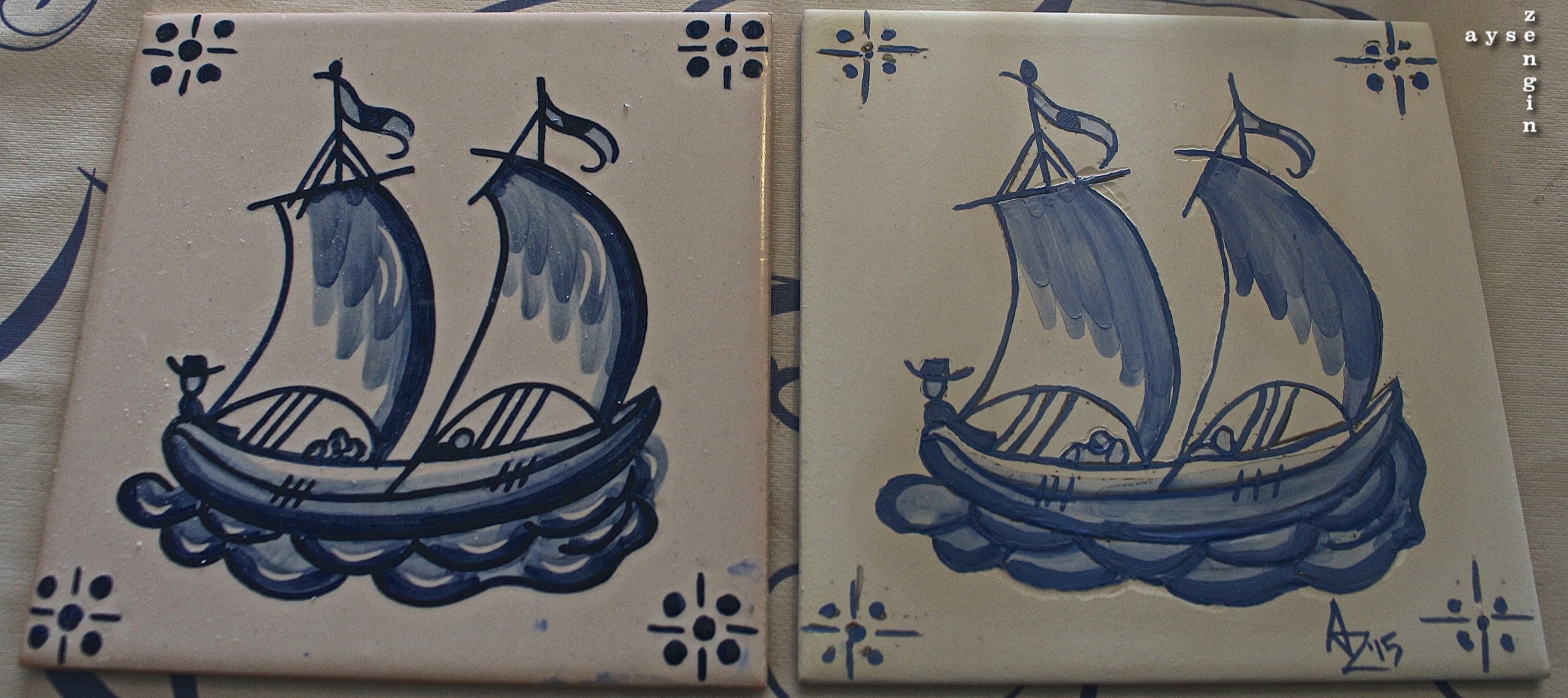 In the end, we all painted a village woman and for my second one I chose to paint a yacht (I love boats!). She had to put them into the kiln so we didn’t get a chance to get them back as we were leaving the next day. However, the teacher dropped them off to my friends house and has them safely (soon to be picked up on another trip to Portugal…). I filmed a bit when the teacher was instructing/demonstrating (apologies for the low light…) and I’ve inserted this video below.